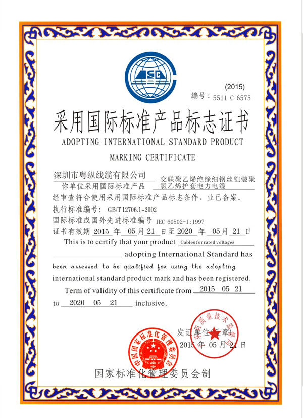采用国际标准产品标志证书